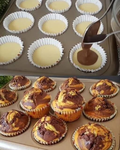 Minden muffin tetejére tegyél egy teáskanálnyi kakaós tésztát, majd fogpiszkálóval keverd el enyhén, hogy márványos hatású legyen.