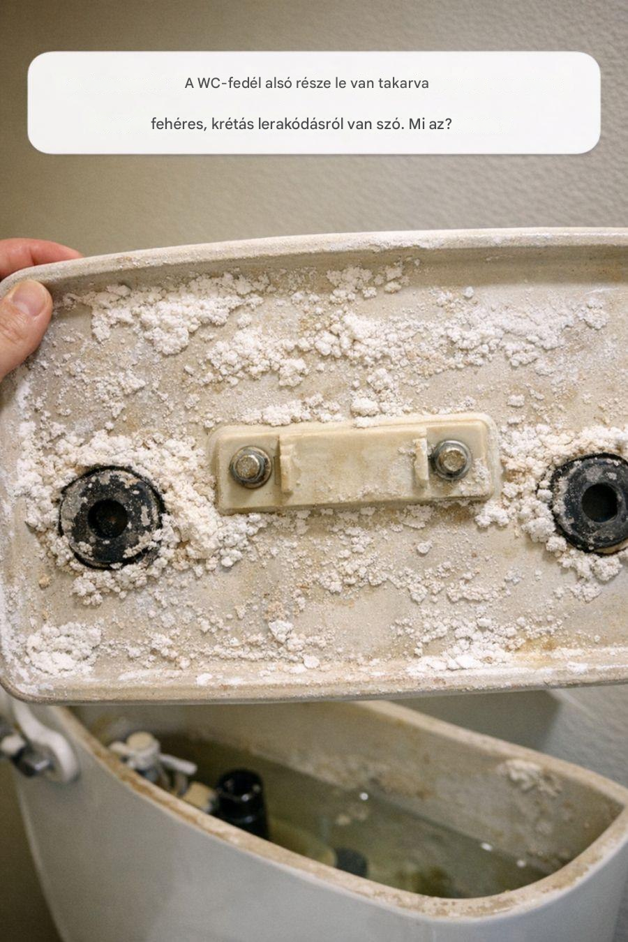 A látható fehéres lerakódás általában a kemény vízből származó ásványi lerakódásoknak köszönhető. A kemény vizet magas ásványianyag-koncentráció jellemzi, különösen kalciumban és magnéziumban. Ahogy a víz ismételten feltöltődik és elpárolog a WC-tartályból, ezek az ásványi anyagok lerakódnak és fokozatosan felhalmozódnak a felületeken.
