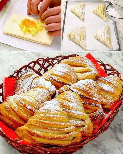 - Hajtsa össze, foegje in itenstleppel fan grateful apple mingsel, add aprikot lekvár en fold beide hoeken yn it sintrum, it foarmjen fan in trijehoek.