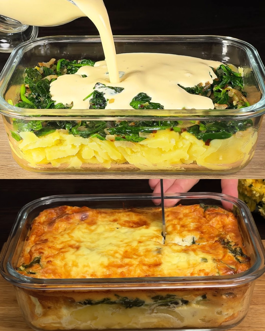 Ez a laktató rakott étel puha burgonyát, párolt spenótot és hagymát rétegez, mindezt gazdag, krémes tojáskeverékben borítva, és aranybarnára sütve. Egyszerű, laktató, és tökéletes ebédre vagy vacsorára.