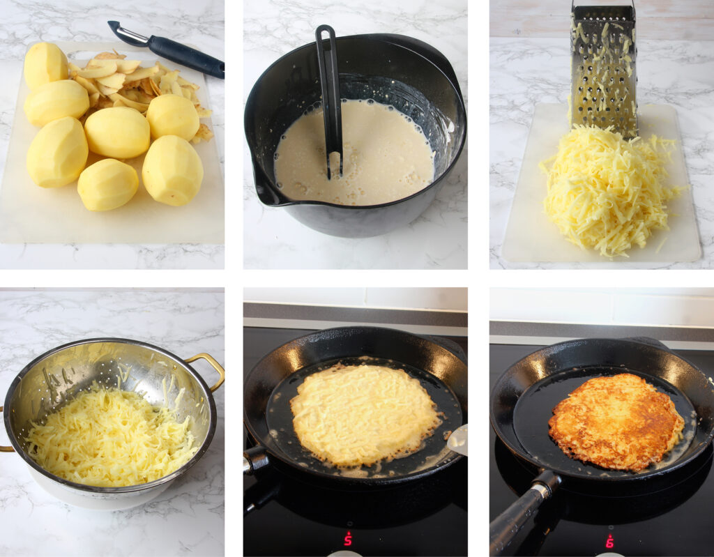 1. Hámozd meg és reszeld le durvára a burgonyát. Nyomd ki a levet egy szűrőedényben.