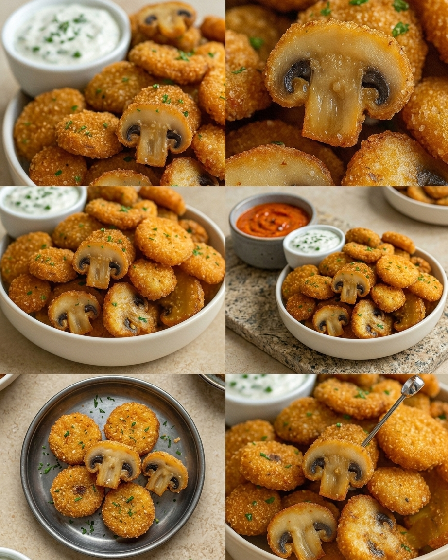 Mártsuk meg mindegyik gombát a lisztbe, majd a felvert tojásba, végül a zsemlemorzsás keverékbe.