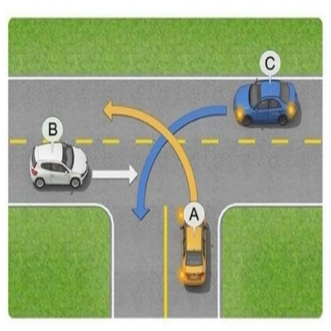 Indoklás: Bár a főútvonalon tartózkodik, balra kanyarodási szándékát jelzi. A kanyarodási szabály értelmében a balra bekanyarodó jármű köteles elsőbbséget adni az úttesten szemből érkező, egyenesen továbbhaladó vagy jobbra bekanyarodó jármű részére. Miután "B" elhaladt, "C" szabadon befejezheti a manővert.