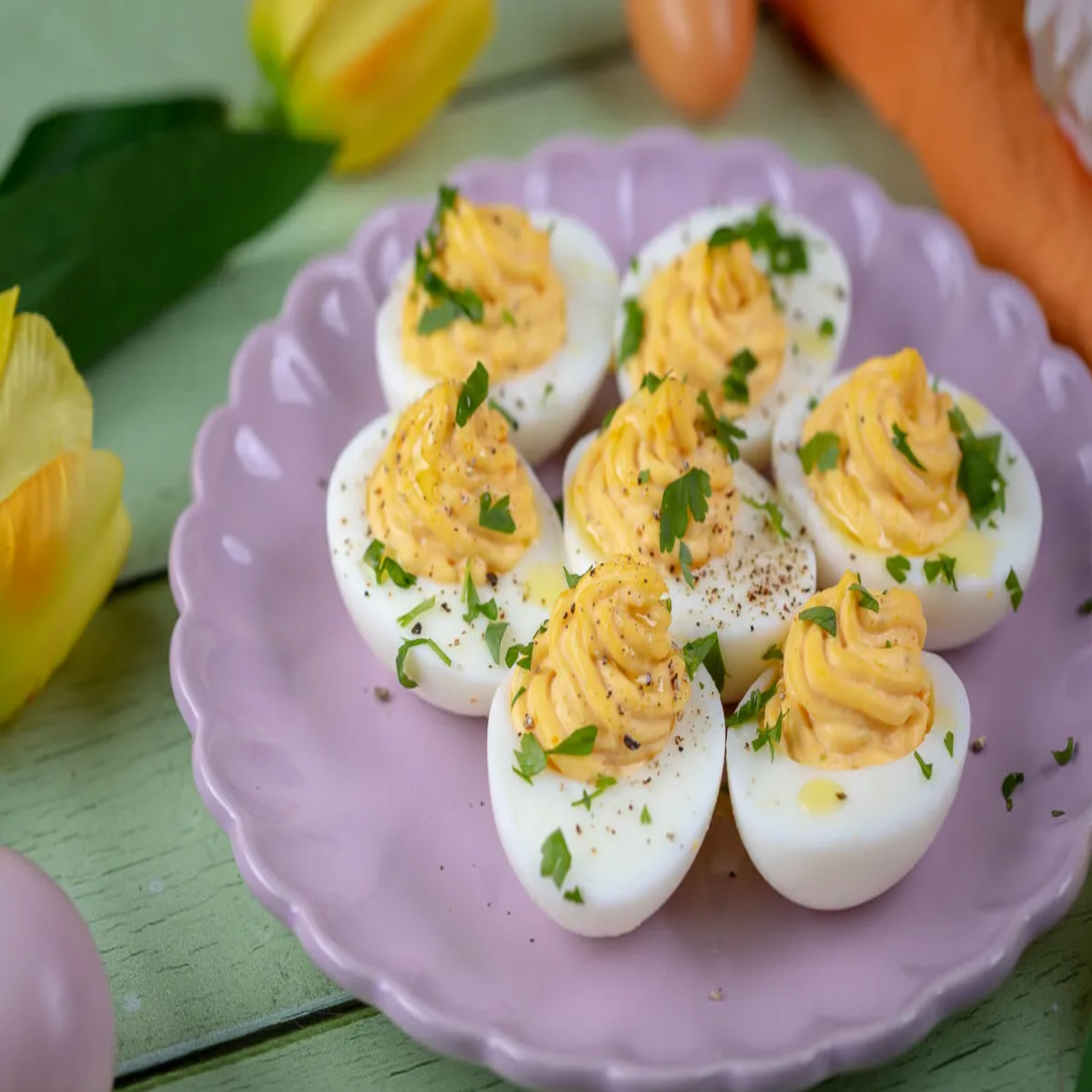 - A tojáskrémet kanál vagy habzsák segítségével visszatöltjük a fehérjékbe. Végül az elkészült töltött tojásokat megszórjuk apróra vágott petrezselyemmel, borssal, és olívaolajat csepegtetünk rá.
