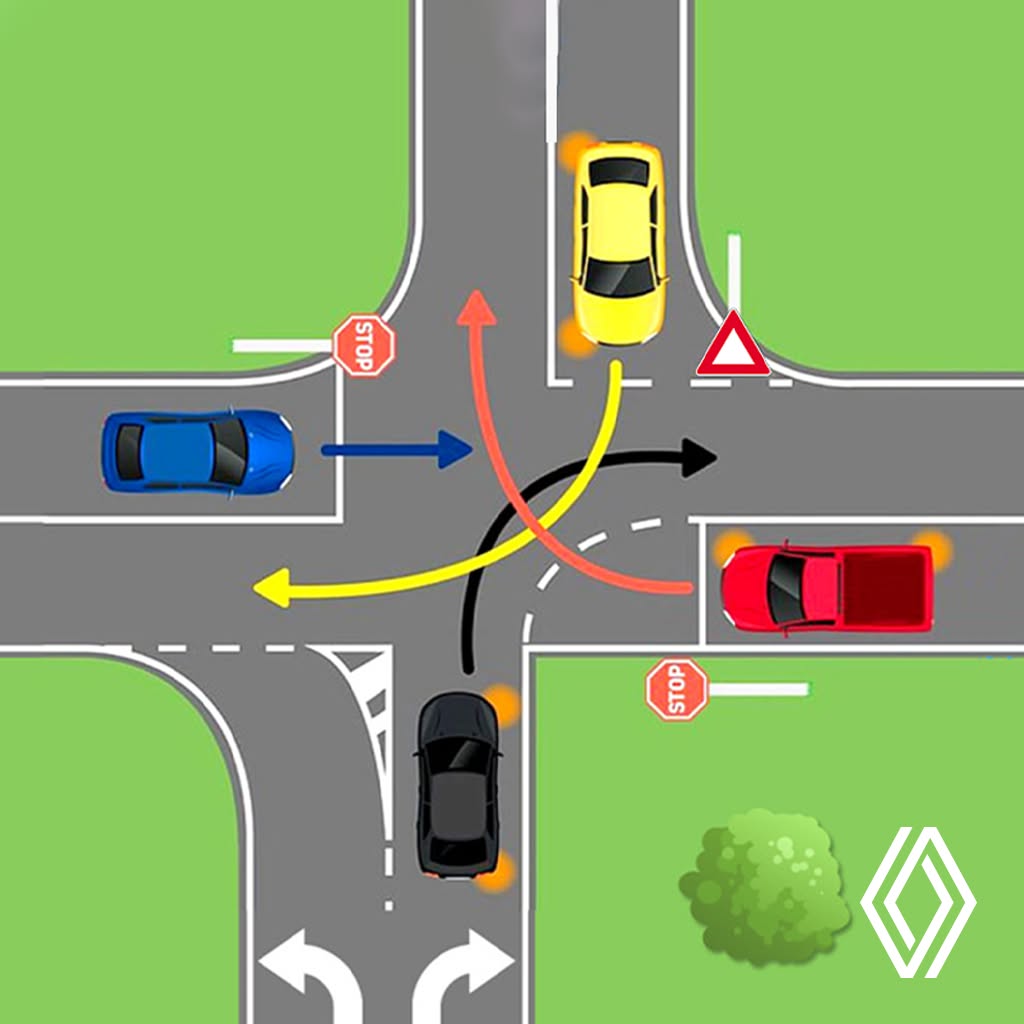 Sárga autó: Ő halad az "Elsőbbségadás kötelező" tábla felől, de mivel balra kanyarodik, elsőbbséget kell adnia a vele szemben érkező, egyenesen haladó vagy jobbra kanyarodó forgalomnak. Azonban a többiek előtt STOP tábla van, ami szigorúbb megállási kötelezettséget ír elő.