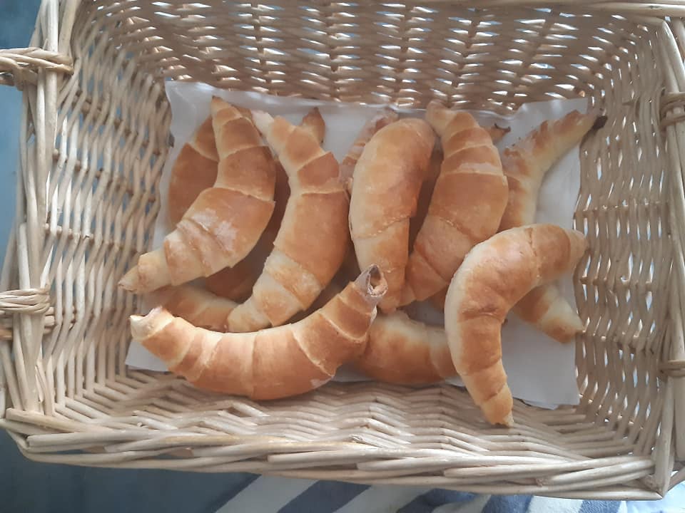 A háromszögeket még nyújtom és feltekerem a nagyobbik és szélesebbik felénél kezdve, majd sütés előtt tejjel megkenem a tetejét! 20 percig sütöm 200 fokra előremelegített sütőben!