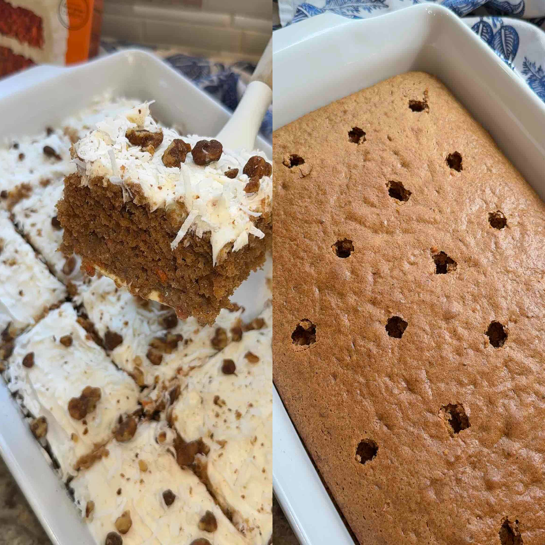A répatorta egy puha, fűszeres répatorta, édes karamellás sűrített tej keverékkel átitatva, krémes mázzal, kókuszreszelékkel és ropogós dióval a tetején.