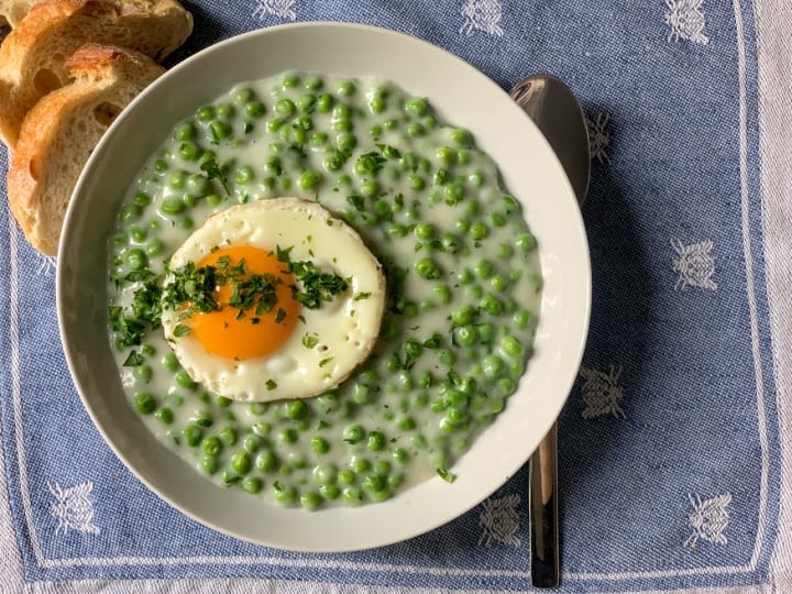 - 5. lépés : A borsópörköltet sekély tálakban tálaljuk, a tetején egy tojással, egy csipetnyi petrezselyemmel, és néhány szelet kenyérrel.